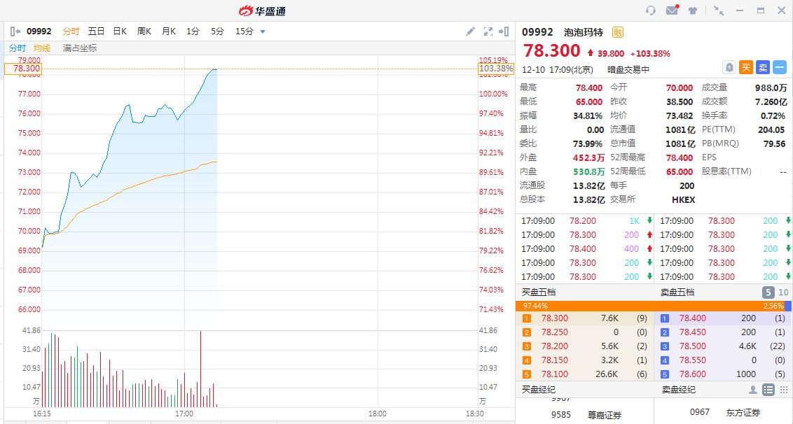 泡泡玛特(09992)暗盘交易正在进行中,目前泡泡玛特涨超100%,市值突破1000亿港元,成交额7.26亿港元。不计手续费,一手盈利7960港元。