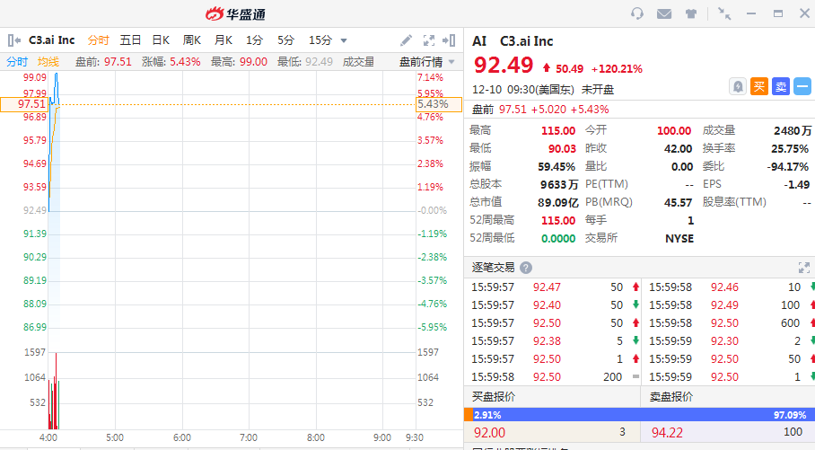 华盛资讯12月9日消息,美股盘前,人工智能服务公司C3.ai盘前再涨超5%,上市首日收涨逾120%。