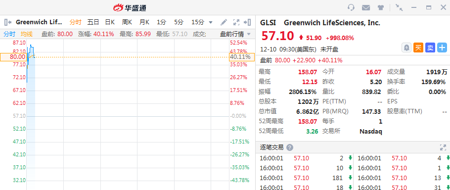Greenwich Lifesciences Inc.盘前涨超40%,昨夜曾暴涨超998%,该公司在圣安东尼奥乳腺癌研讨会(SABCS)上发布的GP2期IIb临床试验五年数据,显示乳腺癌的复发率为0%。