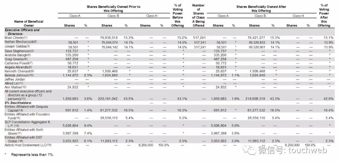 此次IPO前,Brian Chesky有15.4%的B类股,及15.3%投票权;Nathan Blecharczyk、Joseph Gebbia分别持14.2%的B类股及14.2%的投票权;