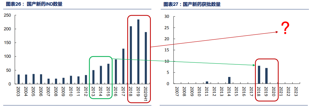 国产新药临床申请数量从2013年开始逐年攀升,近几年更是进入到持续爆发的阶段,2019年国产IND数量达235个,2020年上半年达到189。2018-2019年共有15个国产新药获批上市,主要来源于2013-2015年的IND品种。随着近几年IND数量的爆发式增长,预计未来国产新药每年获批的数量有望进一步增长,达到20个的水平,开启中国创新药产业的大潮。