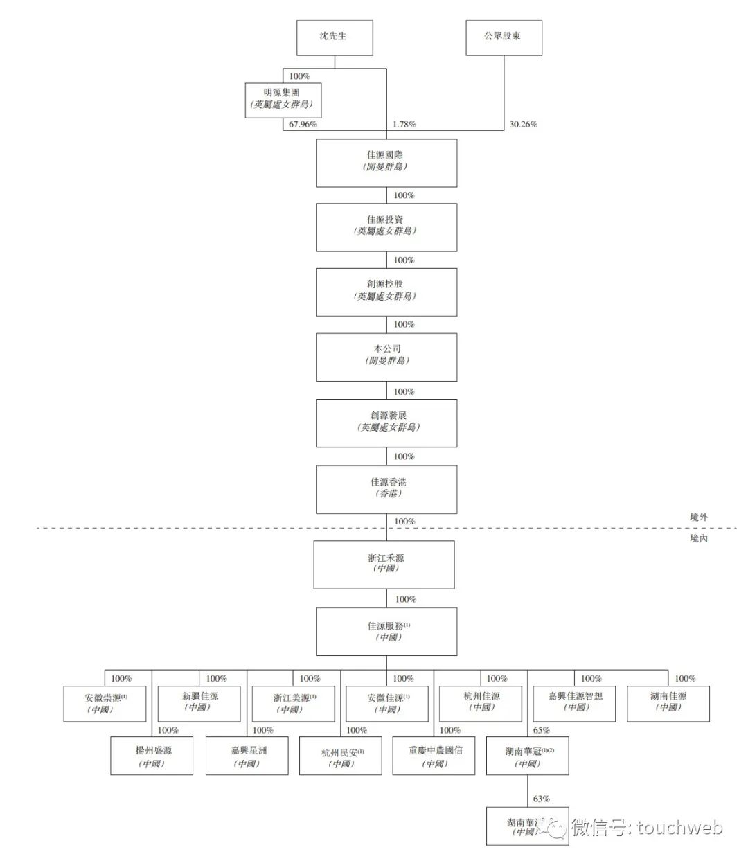 IPO前,沈天晴通过明源集团直接持有佳园国际67.9%股权,直接持股为1.78%,公众持股为30.26%。佳源国际持有佳源服务100%股权。