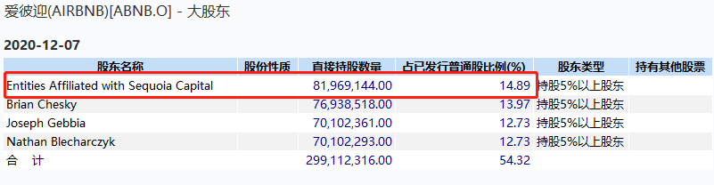 目前持股份额第一的机构是红杉资本,也是公司IPO的最大赢家。在Airbnb上,红杉资本的总投资额为2.6亿美元,占发行前A类股16.6%,发行后占股比例为14.89%,红杉资本的股权价值接近128亿美元,投资回报率达到48倍,令人惊叹!