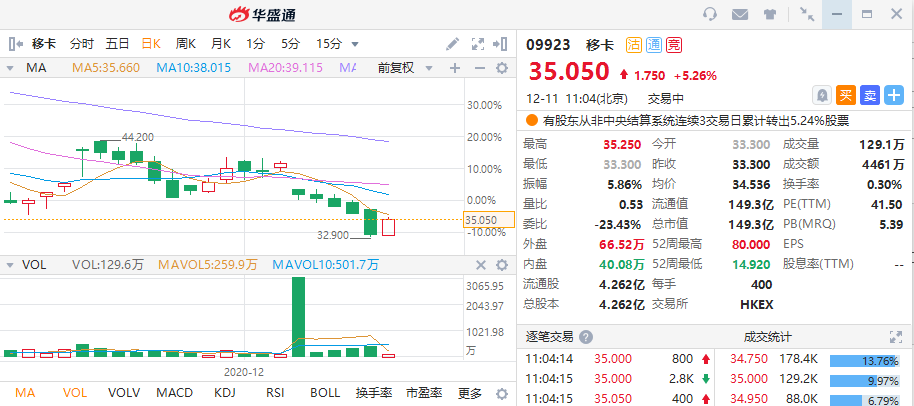 华盛资讯12月11日讯,移卡(09923)盘中强势反弹,一度涨超5%,止步五连阴。截至发稿,移卡大涨5.26%,现报35.05港元每股,当前成交额4461万港元,总市值为149.3亿港元。