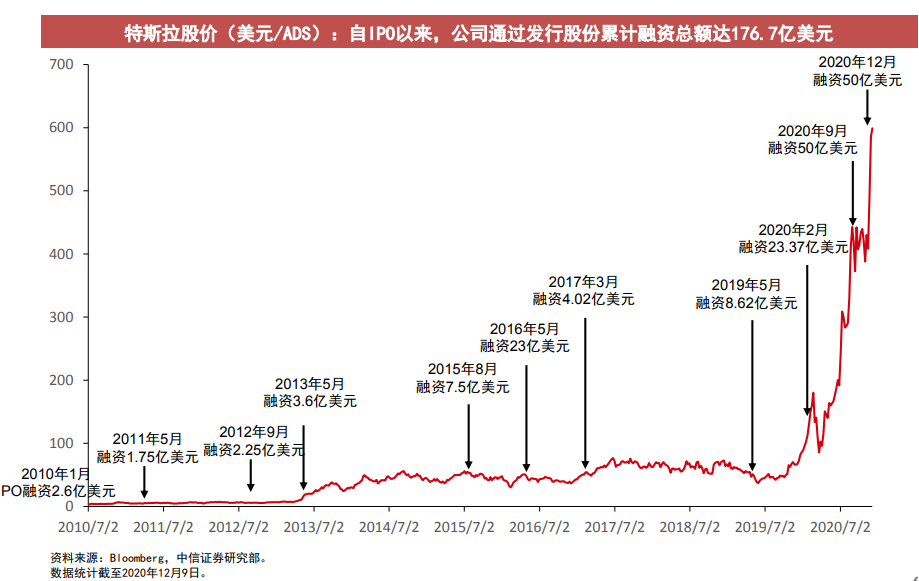 参照特斯拉的融资历程,虽然融资后股价短期会有一段时间的回调,但长期来看,对股价影响较少。