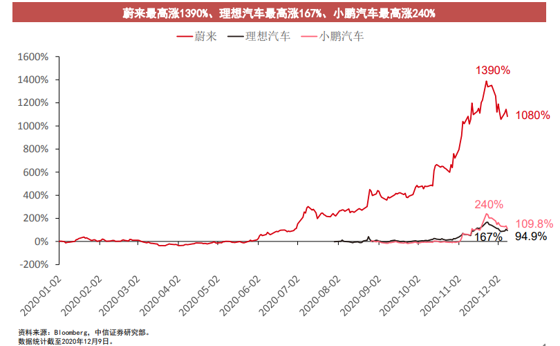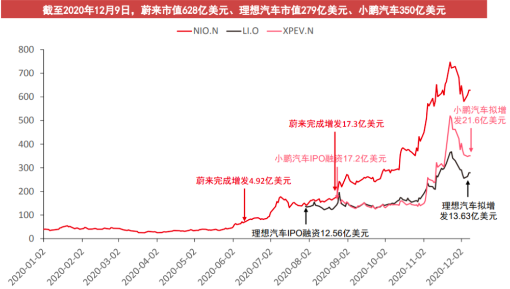 增发背后,是突飞猛进的股价,截至12月10日,蔚来今年涨幅高达1390%,理想汽车上涨超167%,小鹏汽车最高涨240%。增发过后,新能源汽车的股价未来还能百尺竿头更进一步吗?要回答这个问题,必须理解增发对新能源车企的意义。