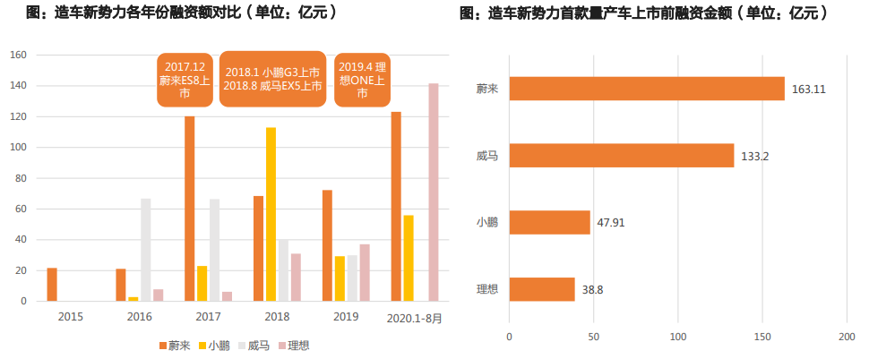 四大造车新势力跟随产品研发节奏,扩大融资规模。15年至今,蔚来融资427亿元,威马融资203亿元,小鹏融资224亿元,理想融资224亿元,四家累计已超千亿。从首款量产车上市前融资额对比的角度看,蔚来以163.11亿元第一,威马第二为133.2亿元,小鹏和理想相对节约,首款车上市前仅分别融资47.9亿元、38.8亿元。