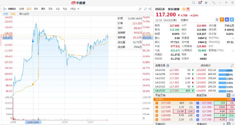 京东健康午后涨4%,截止发稿,涨4.18%,报117.2港元,成交额8.64亿港元。