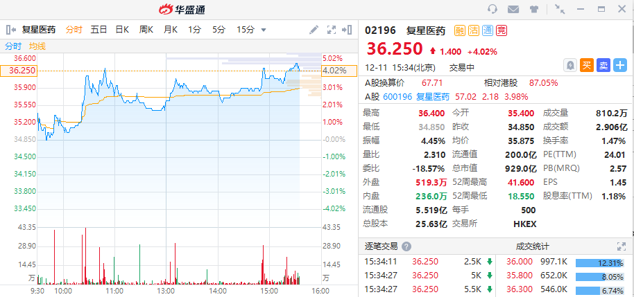 华盛资讯12月11日消息,复星医药(02196)盘中异动,尾盘涨超4%。截至发稿,复星医药涨4.02%,现报36.25港元,成交额达2.906亿港元,总市值929亿。