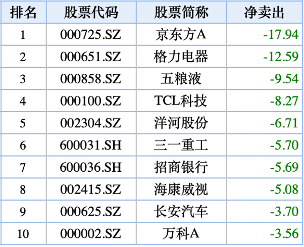 本周,北上资金净卖出金额最多的个股是京东方A,一周抛售近18亿元。抛售金额排第二的是格力电器,一周卖出12.59亿元。