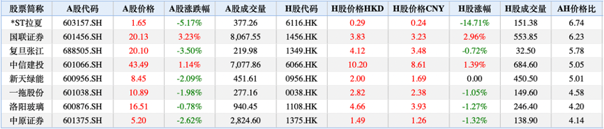 个股方面,ST拉夏、国联证券、复旦张江、中信建投、新天绿能等个股仍然位列溢价榜首,投资者可关注相关个股估值回归机会。
