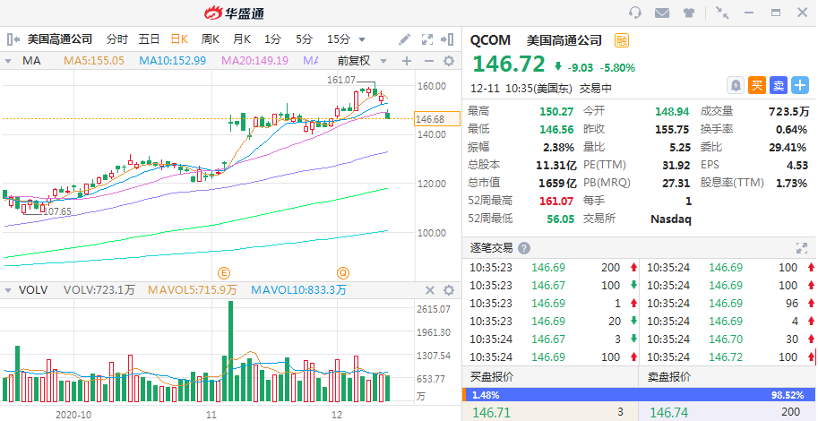 华盛资讯12月11日消息,美股盘初,高通股价短线迅速下跌,截至发稿跌近6%,报146.72美元。据知情人士透露,苹果芯片业务主管周四告诉员工,该公司已经开始为未来设备自研蜂窝调制解调器,以取代高通公司的组件。