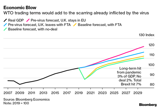 在疫情令英国GDP遭遇三个世纪以来的最大冲击后,无协议脱欧对经济的影响可能不会那么剧烈。
