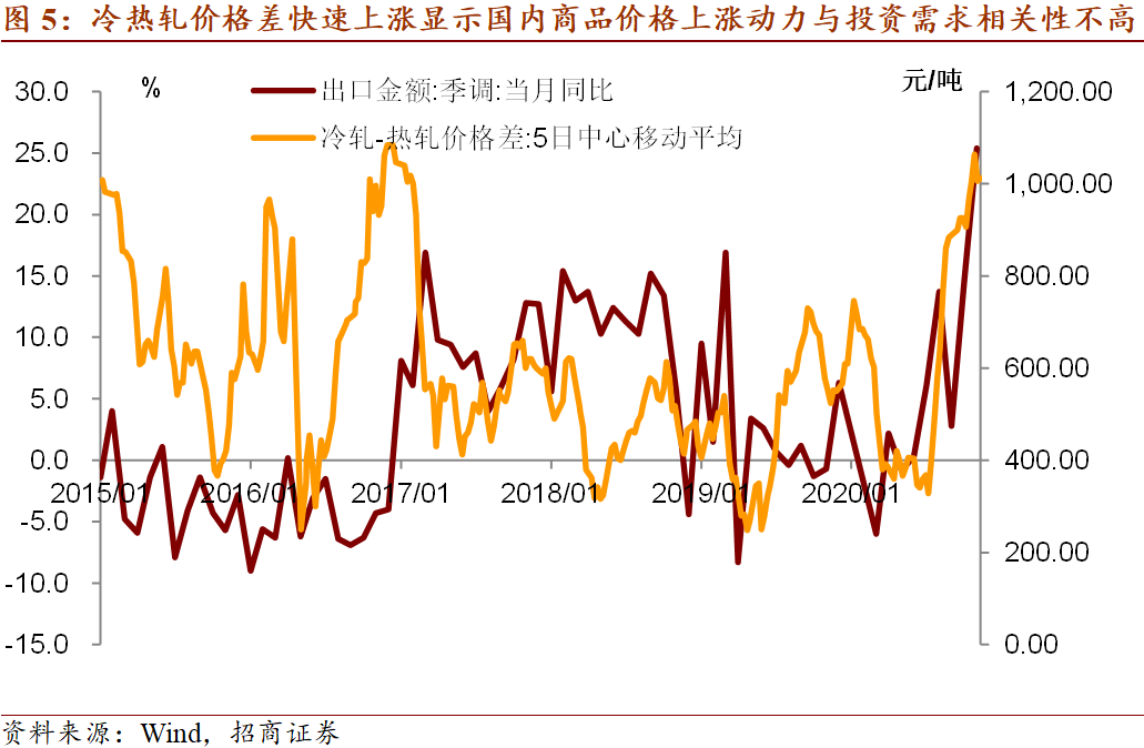 我们用冷轧板卷价格代表消费和出口需求,热轧板卷价格代表投资需求。冷轧板材一般用于汽车、家电等产品,而热轧板材主要用于桥梁、铁路、建筑等领域。二者价格差大致可以作为观察消费、出口需求与投资需求的变化情况。目前冷轧板卷价格已经超过热轧板卷价格1000元/吨以上,达到2017年以来的最高点。冷轧板卷价格显著高于热轧板卷价格,与当前汽车销售强劲以及国内和美国房地产销售增速持续改善等情况相吻合。从历史数据看,冷热轧板卷价格差与我国出口增速相关性较高。因此,尽管明年国内基建投资和房地产投资需求都可能受到稳杠杆政策的抑制,但海外需求的修复有望推动国内商品价格的进一步修复。