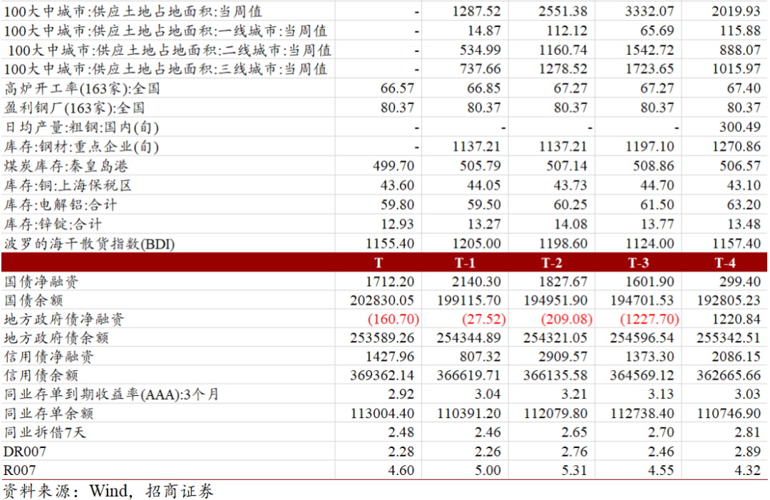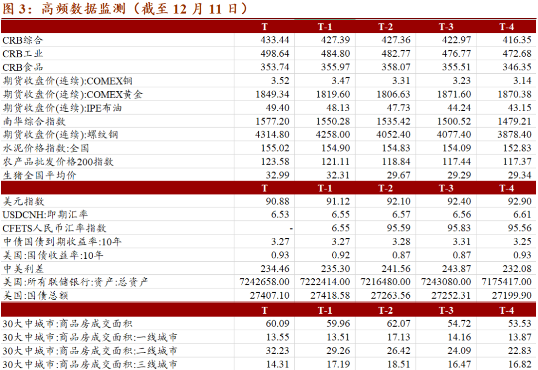 3. 高频周度观测:海外国内商品持续走强。本周,CRB指数持续走强。南华综合指数表现强劲。农产品批发价格200指数、COMEX铜、COMEX黄金、IPE布油、螺纹钢期货等均不同幅度上涨。