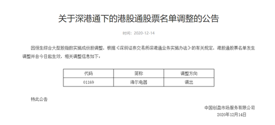 新浪科技讯 12月14日上午消息,深交所发布公告称:因恒生综合大型股指数实施成份股调整,将海尔电器调出港股通股票名单,自今日起生效。