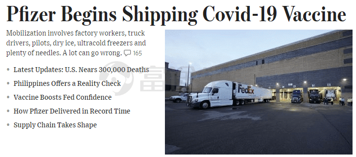 满载新冠疫苗的卡车从辉瑞公司的密歇根州卡拉马祖工厂驶出。在卡车上装有无数传感器监控着疫苗环境。疫苗需要在全国数千个地方消耗掉大量低温冰箱、干冰、针头、口罩和棉签等。