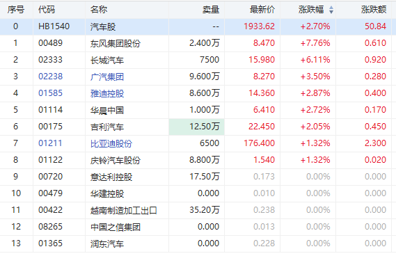 长城汽车涨6.11%,广汽集团涨3.50%。雅迪控股、华晨中国、吉利汽车皆涨超2%。