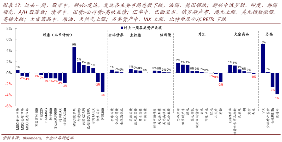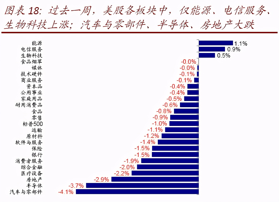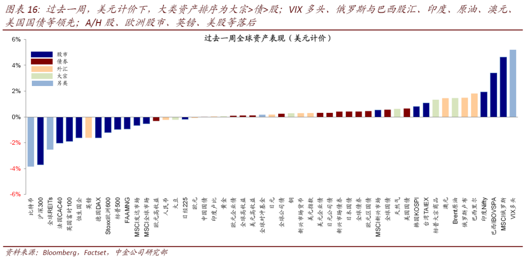 ►资产表现:大宗>债>股;发达下跌、实际利率回落。过去一周,美元计价下,VIX多头、俄罗斯与巴西股汇、印度、原油、澳元、美国国债等领先;A/H股、欧洲股市、英镑、美股等落后。美股各板块中,仅能源、电信服务、生物科技上涨,汽车与零部件、半导体、房地产等大跌。此外,10年美债利率回落,特别是实际利率。