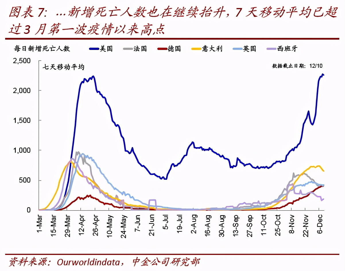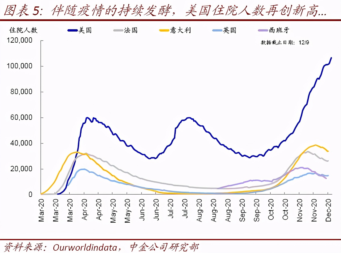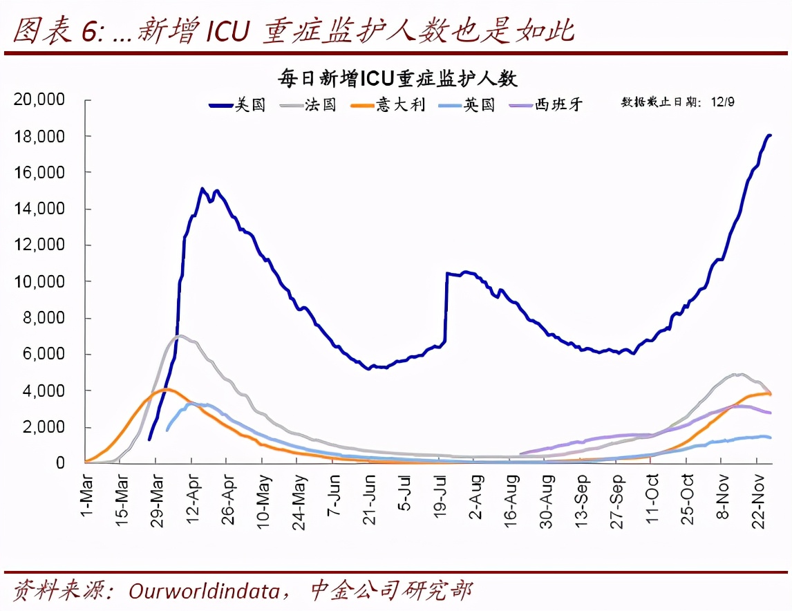 短期来看,市场主要受疫情、疫苗和政策刺激这三股力量赛跑和拉锯的影响。1)如果仅看疫情的话,当前美国正在面临的第三波疫情严重程度要甚于以前过去一轮、对医疗资源的挤兑也愈发明显;新增、住院、ICU、死亡都早已超出3月高点。2)因此,如果没有11月以来多支疫苗积极进展的支撑,市场很难独善其身。周末FDA批准辉瑞首支疫苗在美国使用,具有重要“托底”意义,特别是对市场而言。但从疫情实际防控看,疫苗“远水不解近渴”,采取更多防控措施尽快压平曲线依然是必要的。3)疫情不断升级也使得新一轮财政刺激的必要性和期待增加,但短期缺乏进展,可能要到明年初。
