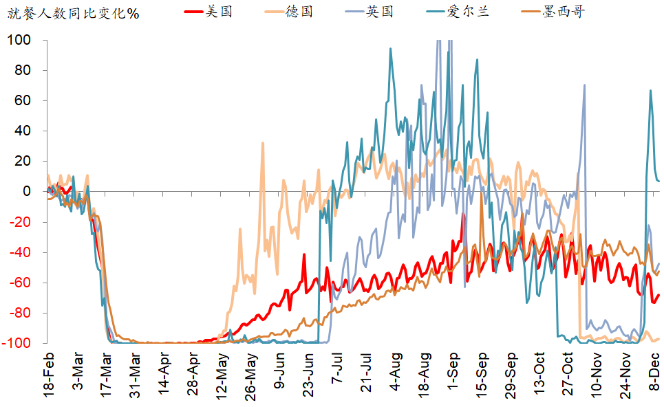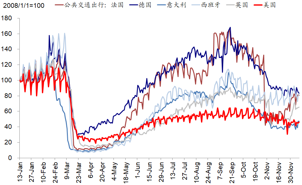 为了控制疫情蔓延,美国更多州开始出台疫情防控限制性措施。例如,纽约州州长下令从下周起将再次关闭室内餐厅,私人住宅的室内及室外聚会不得超过10人[1];加州州长宣布新的居家隔离令,并禁止在ICU病床可使用率低于15%的地区展开任何规模的聚会,除关键设施和零售业外其余商业运营全部关闭,要求强制佩戴口罩[2]。当前疫情的不断升级和防控措施的不断出台难免继续拖累复工进展,这从近期公布的宏观数据也能得到印证,例如上周首申人数从前一周的71.6万人再度攀升至85.3万人。目前欧美复工进展约为疫情前的65%,在过去的一个月基本持平微降。