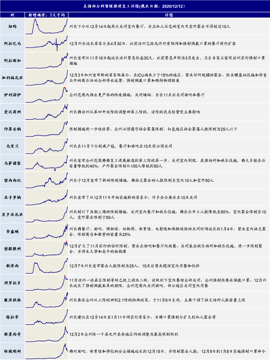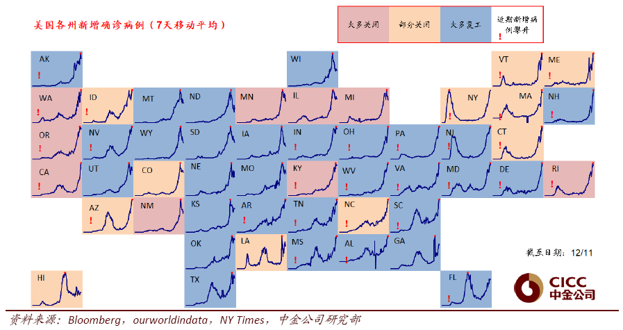 i. 疫情:美国第三波疫情持续升级,继续沿着新增>>住院>>ICU>>死亡的链条快速传导,各方面仍在恶化。与此同时,更多州也都开始出台更为严格的限制措施以应对疫情的升级。