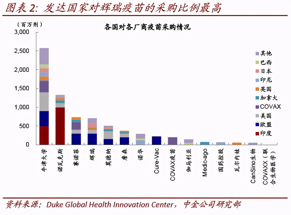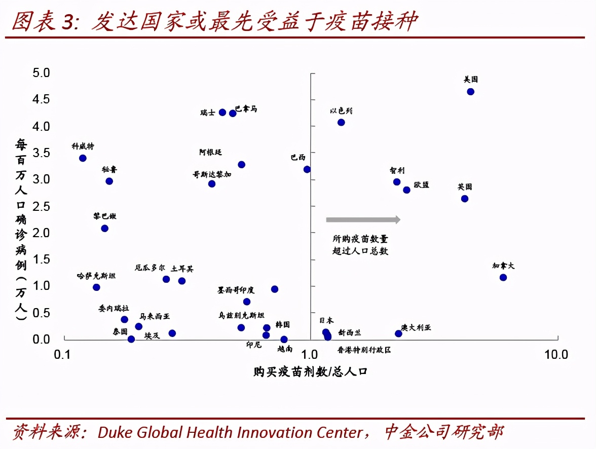 从各国采购情况来看,发达国家大幅领先新兴市场,与我们在2021年展望《疫情径曲、补库通幽》中分析的情形一致。从各国采购的疫苗情况看,当前备选疫苗领先的辉瑞和Moderna疫苗订单最多的国家和地区主要分布在欧盟、美国、英国、加拿大和日本。根据杜克大学的统计,截止2020年12月11日,美国共订购了1亿剂辉瑞疫苗和1亿剂Moderna疫苗[8],“曲速行动”项目果没有11月以来多又增加了1亿剂Moderna疫苗的订单[9]。值得注意的是,疫苗运输同时受到政府批准速度、产能、和运输能力(-70℃)三个因素影响[10]。