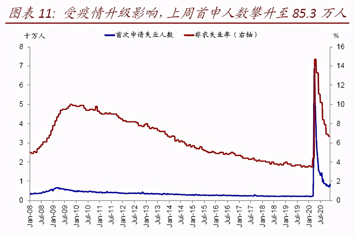 iii. 财政刺激:新一轮财政刺激仍值得期待,但短期缺乏进展。疫情的持续升级以及封锁措施对增长和需求的拖累都意味着新一轮财政刺激依然必要且关键,但短期来看进展缓慢。此前共和民主两党在刺激规模上的分歧较大(民主党2.2万亿美元vs.共和党5000亿美元),财政部长姆努钦周二向众议院长佩洛西提出规模9160亿美元的提议,包括个人和家庭补贴,但取消了每周300美元的失业救济。当前该计划受到两党关注,两党也正在协同完善此前由参议院推出的9080亿美元的刺激方案版本。不过由于圣诞节临近,美国国会将于21日休会至年末,所以如果下周仍无进展的话,新一轮财政刺激在年内通过的概率相对较低[11]