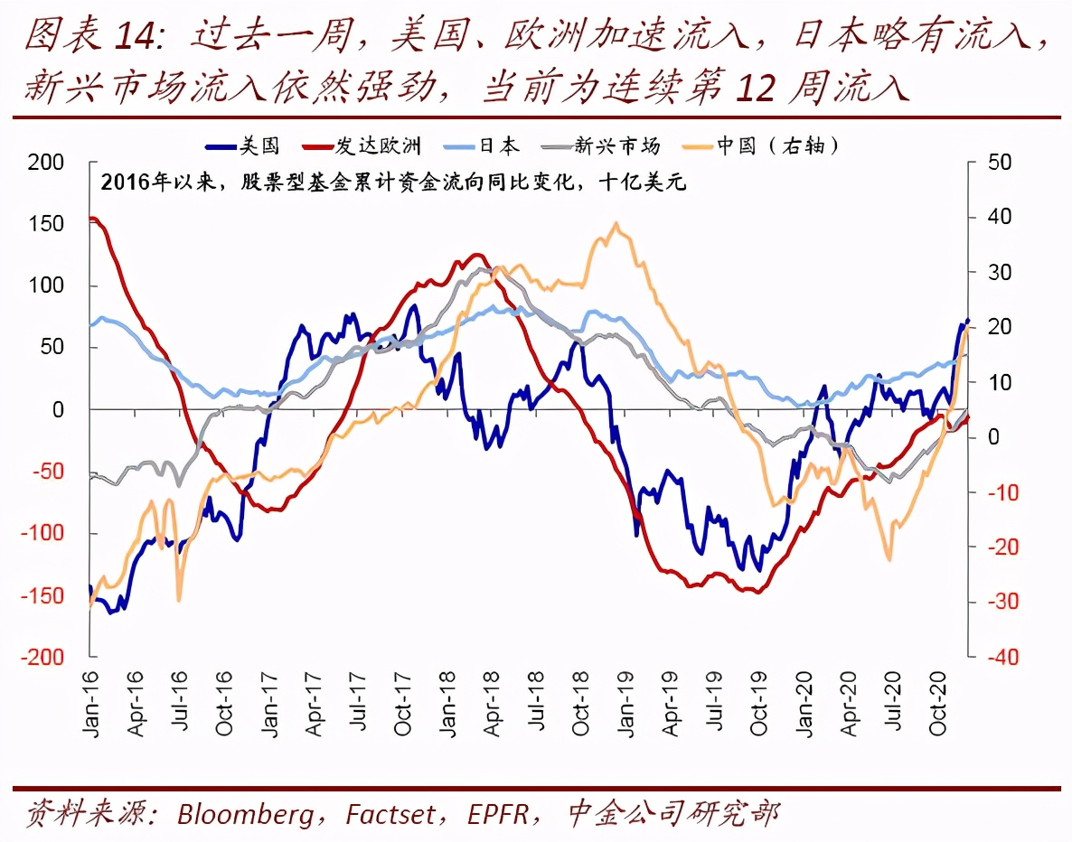 ►资金流向:欧美加速流入,中国继续吸引资金大幅流入。过去一周,美国、欧洲流入加速,新兴市场流入也依然强劲,为第12周流入,其中中国继续吸引大量资金。债券方面,高收益债及信用债流出,利率债转为大幅流入。