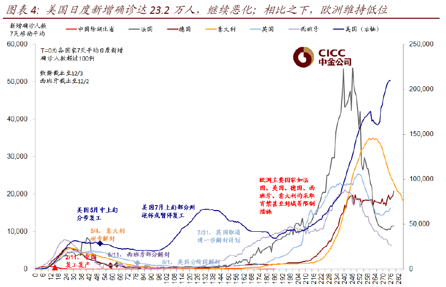 疫情、疫苗和财政刺激是三股左右短期市场表现的主要力量。正是得益于11月以来多支疫苗的积极进展,风险偏好特别是顺周期资产能够在疫情持续升级下大幅反弹。当前,美国疫情仍在升级尚无改善迹象,而FDA刚刚批准了首支辉瑞疫苗在美国的使用,但财政刺激谈判却依然进展缓慢。我们梳理了上述这三个变量的变化如下,供投资者参考。