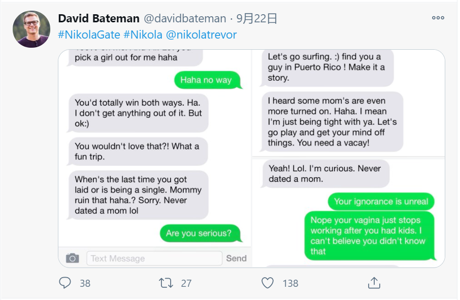 今年4月份,就在尼古拉正在为上市做准备的时候,这些截图就险些进入公众的视线。当时米尔顿的一位好友乔尼·罗伯(Jonny Robb)威胁米尔顿要将这些截图发布在自己Ins主页上。根据米尔顿10月份对贝特曼的诉讼记录,乔尼·罗伯曾向尼古拉创始人索要50万美元。