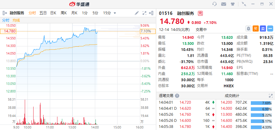 华盛资讯12月14日消息,融创服务(01516)午后持续走高,上涨超7%,创历史新高,盘中最高见14.94港元。截至发稿,融创服务涨7.10%,现报14.78港元每股,当前成交额1.319亿港元,总市值443.4亿港元。
