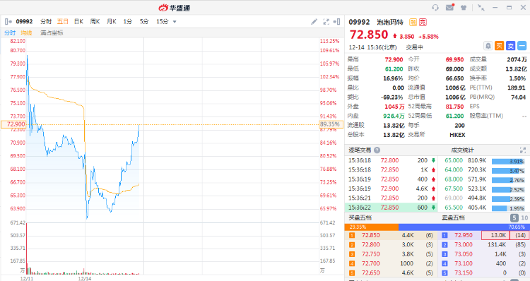 12月14日消息,泡泡玛特陷入割年轻人韭菜风波,股价一度跌超10%,午后反弹,截至发稿,泡泡玛特涨超5%,市值再度超1000亿港元。