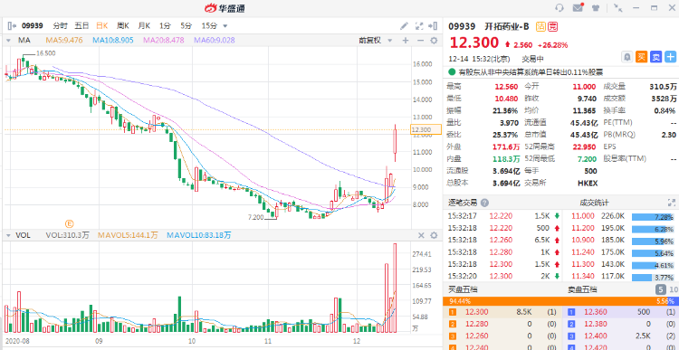 开拓药业-B尾盘涨幅扩大逾25%,截至发稿,涨26.28%,报12.3港元,成交额3528万港元。