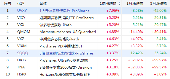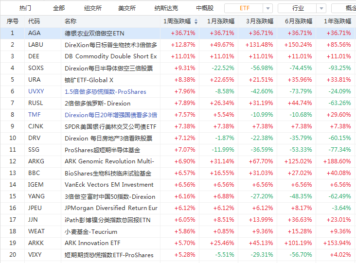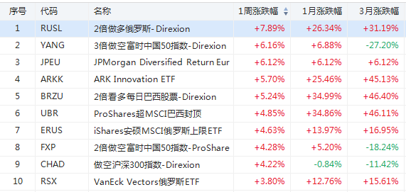 新兴市场稳定上扬,唯沪深300指数回调,其中2倍做多俄罗斯的RUSL周涨近8%,近一个月涨幅超过26%;2倍做多巴西的BRZU周涨超5%。