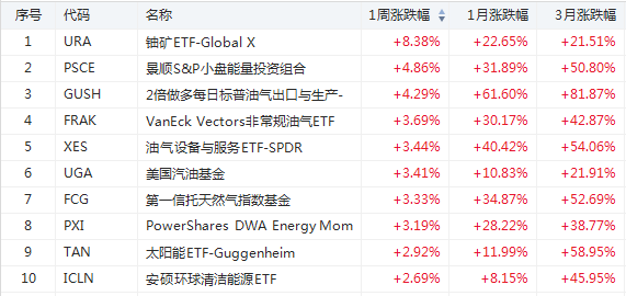 板块表现也呈现出分化态势,其中核心科技股表现相对疲软,FAAMG中仅苹果录得上涨。铀矿股集体飞涨,不带杠杆的铀矿ETF URA猛涨8.38%,为上周表现最佳无杠杆ETF;生物技术板块表现也很突出,3倍做多标普生物技术股的LABU周涨12.87%;因前一周涨幅过大,半导体板块上周则回落较多,3倍做空半导体的SOXS周涨9.31%。