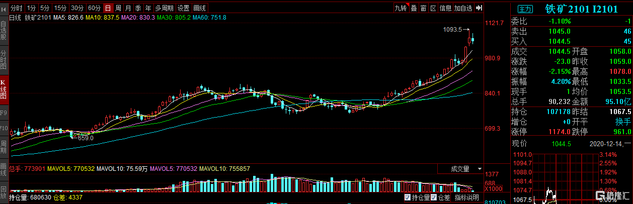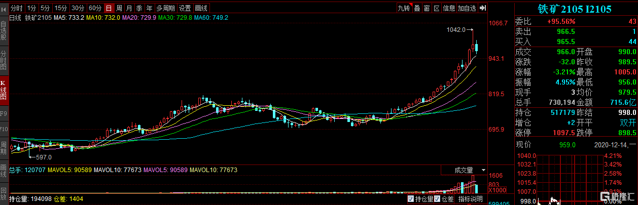 铁矿石一涨,钢企纷纷坐不住了,齐声呼吁监管层面采取有效措施,稳住市场价格,以抑制这场看起来十分过热的炒作。毕竟从铁矿石交易层面上看,就铁矿石2105合约成交量达到715.6亿,资金的动作可谓是十分疯狂了。