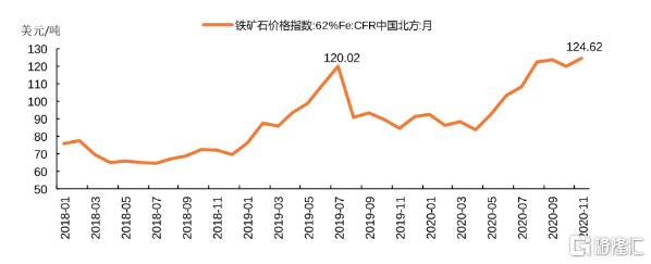 另外,在需求方面,由于我国疫情最早得到受控,复工复产平稳步入正轨,尤其是在新基建的驱动之下,前10月国内制造业采购经理指数(PMI)凭借52.1%创出三年以来的新高,使得铁矿石等原材料补库存需求进一步得到释放;而由于国外高品矿价格飞涨,为减少成本,国内钢企加大对中低品铁矿的采购,充分消耗了港口库存量(截至12月11日,国内45港铁矿石库存总量为12203.2万吨,已经连续6周下降),使得供需缺口进一步扩大,助涨了铁矿石价格。