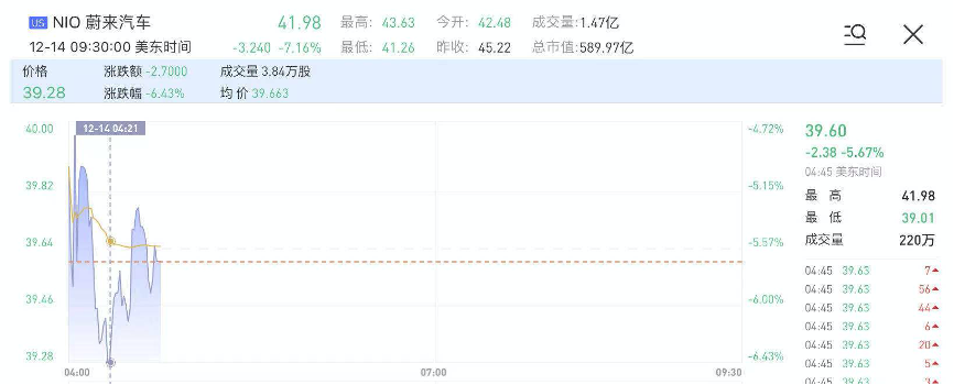 华盛资讯12月14日讯,蔚来汽车(NIO)盘前一度大跌超6%,截止发稿蔚来仍跌超5%。