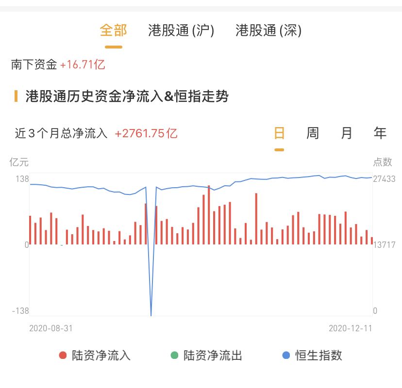 南下资金今日净流入港股16.71亿港元,相比于上周五流入规模增加。