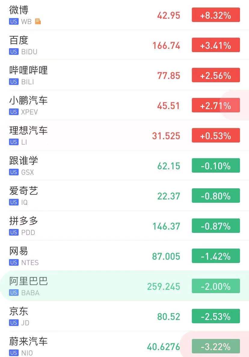 华盛资讯12月14日讯,中概股开盘涨跌不一。截止发稿,微博大涨超8%,百度涨超3%,哔哩哔哩、小鹏涨超2.5%。此外,蔚来跌超3%,阿里、京东均跌超2%。