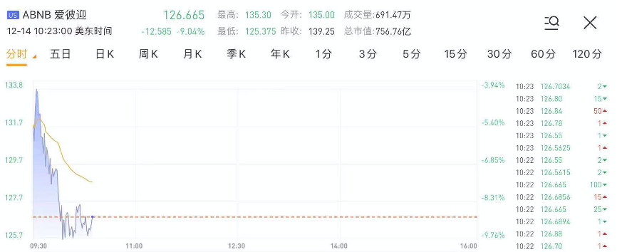 华盛资讯12月14日讯,次新股爱彼迎(ABNB)遭机构下调评级,股价一度跌近10%。截止发稿,爱彼迎跌9.04%,现报126.66美元,当前总市值为756.76亿美元。