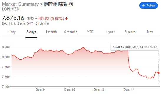 (阿斯利康(LON:AZN)股价走势图,来源:谷歌)