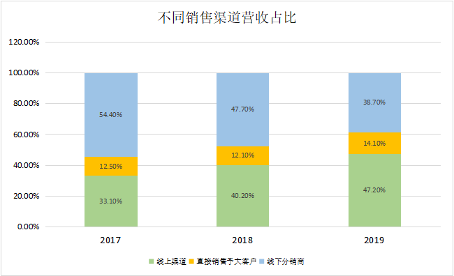 根据招股书数据,在渠道结构上,蓝月亮2017-2019年线上渠道贡献的营收占比逐步提升,2019年线上营收占比总营收的47.1%。
