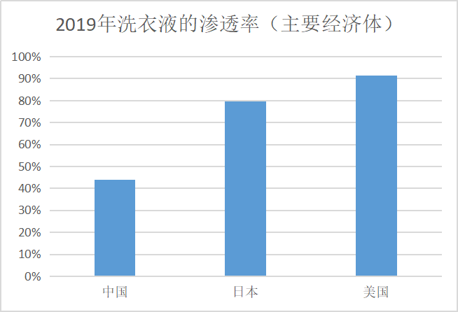 在全球主要经济体中,2019年日本市场的洗衣液渗透率为79.5%,美国市场的洗衣液渗透率高达91.4。与之相比,国内同期的洗衣液渗透率仅为44%。