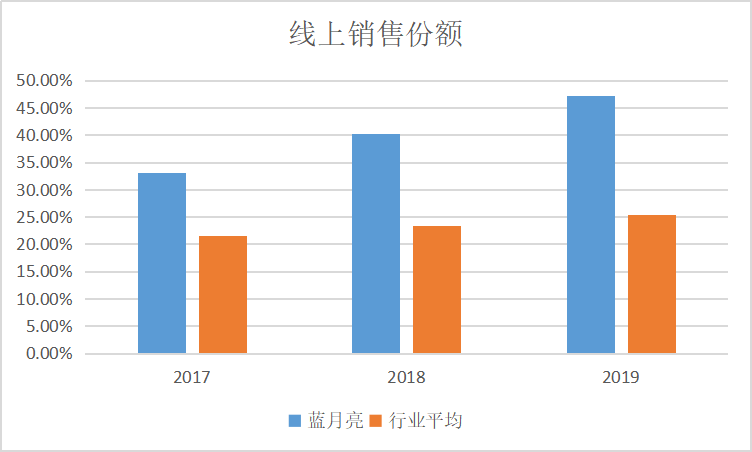 把握机会,重磅布局线上的蓝月亮,业绩快速释放。如下图所示,2017-2019年蓝月亮线上销售份额高于行业平均水平。