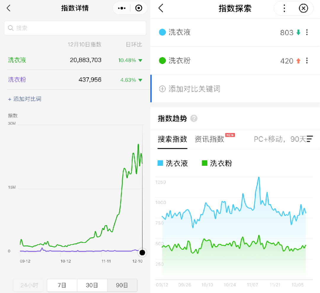 根据最近的微信指数(下图左),洗衣液的热度指数(90天内)以及环比增速,都远高于洗衣粉;百度指数也是同样的趋势,洗衣液的搜索指数远高于洗衣粉。