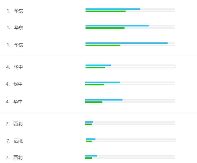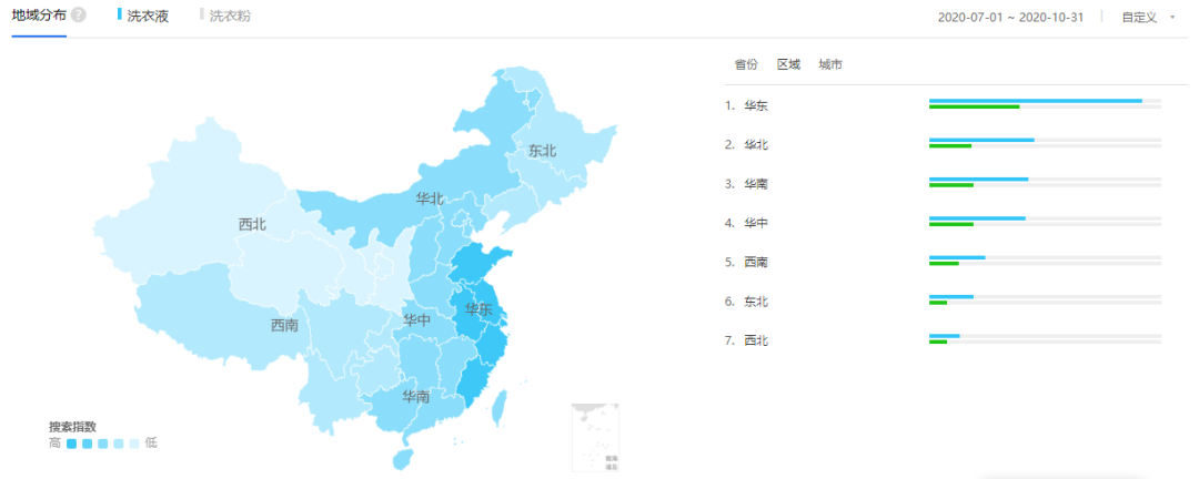 百度指数反馈显示,随着时间的推移,国内洗衣液的渗透率的确呈上升趋势。但渗透率程度在不同地区,却表现不同——从下图可以看到,渗透率从东到西在依次减弱。