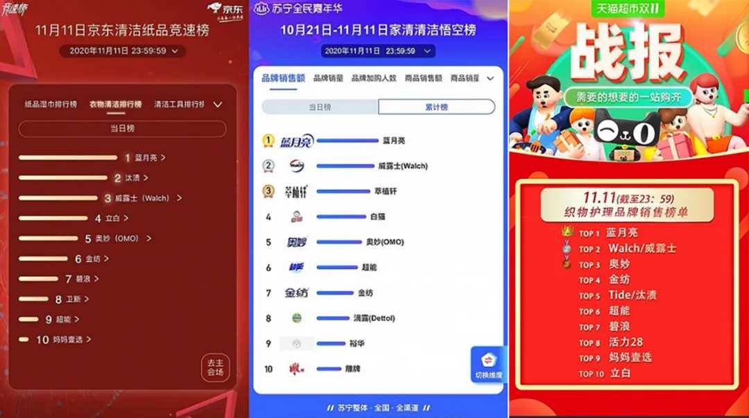 以今年双十一为例,在三大平台上,蓝月亮的销售额均排在第一位。