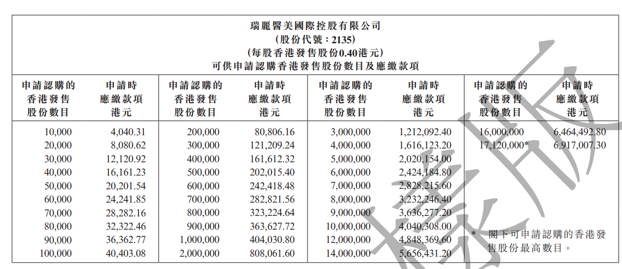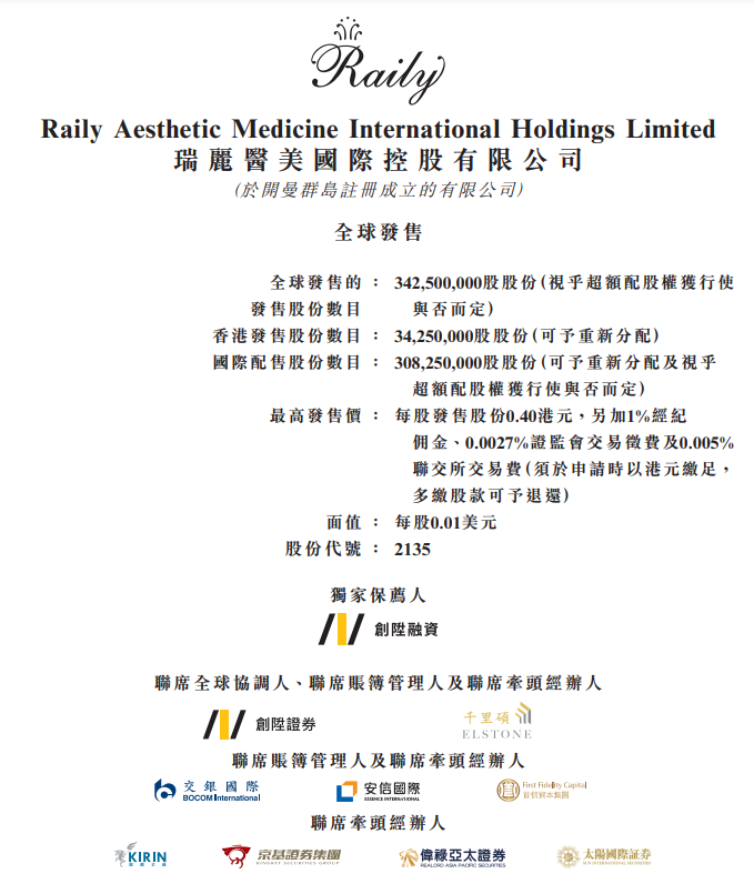 华盛资讯12月15日,瑞丽医美(02135)今日起12月18日招股,拟发行3.425亿股,其中公开发售占比10%,国际配售占比90%,另有15%超额配股权,每股发行价0.3-0.4港元,每手10000股,入场费4040港元,预期2020年12月28日上市。保荐人为创升融资。